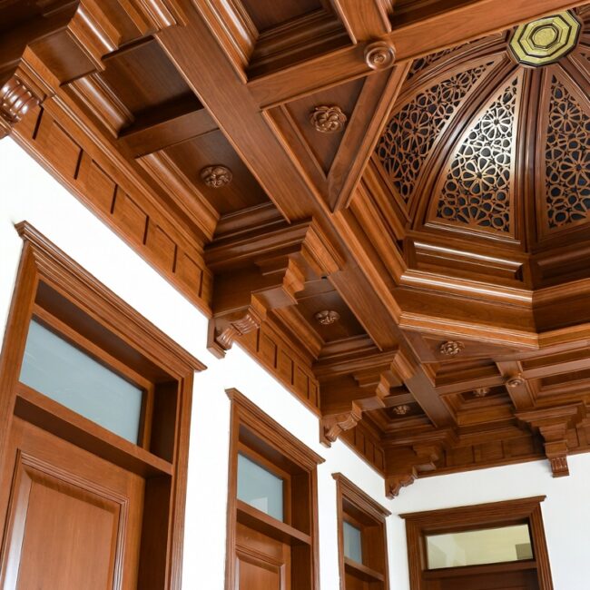 We produce high-end wooden ceiling systems such as coffered ceilings, exposed beam ceilings, and suspended wooden grids. Decorative works include hand-carved corbels, moldings, rosettes, domes, and Islamic elements for mosques and luxury spaces